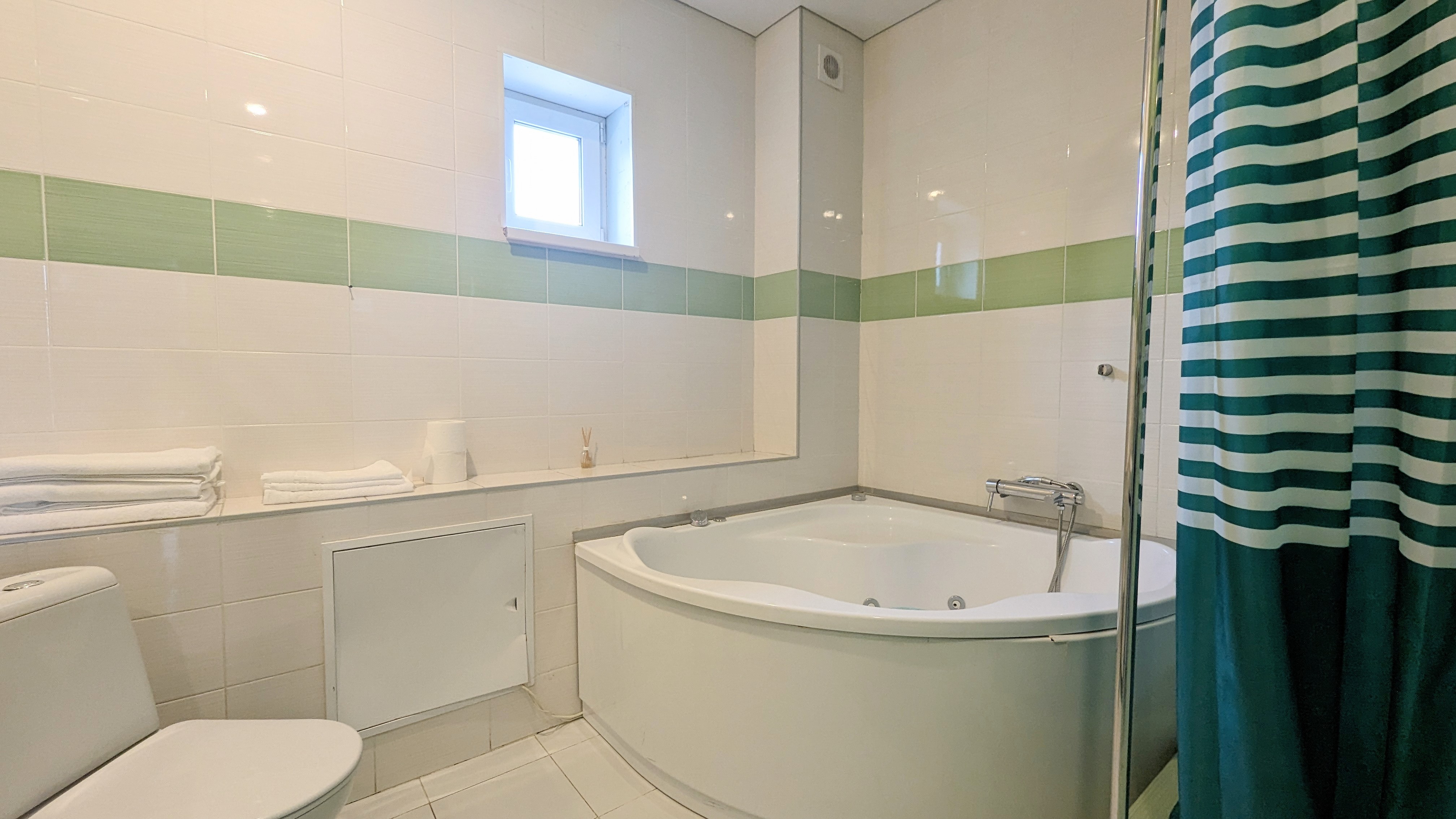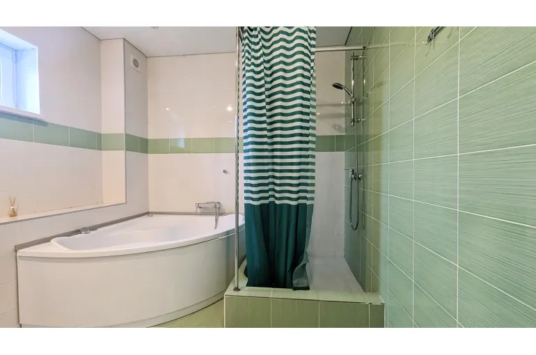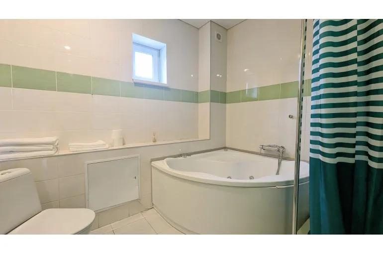 На втором этаже большой санузел с джакузи и 3 просторные жилые комнаты. С двуспальными кроватями и кресло кроватями. Детская кроватка, стульчик для кормления, детская игровая зона с игрушками. На всей территории бесшовный wi-fi. фоновая музыка на всей территории.