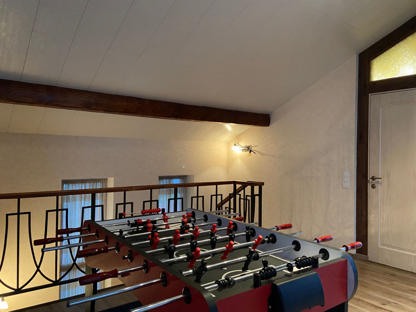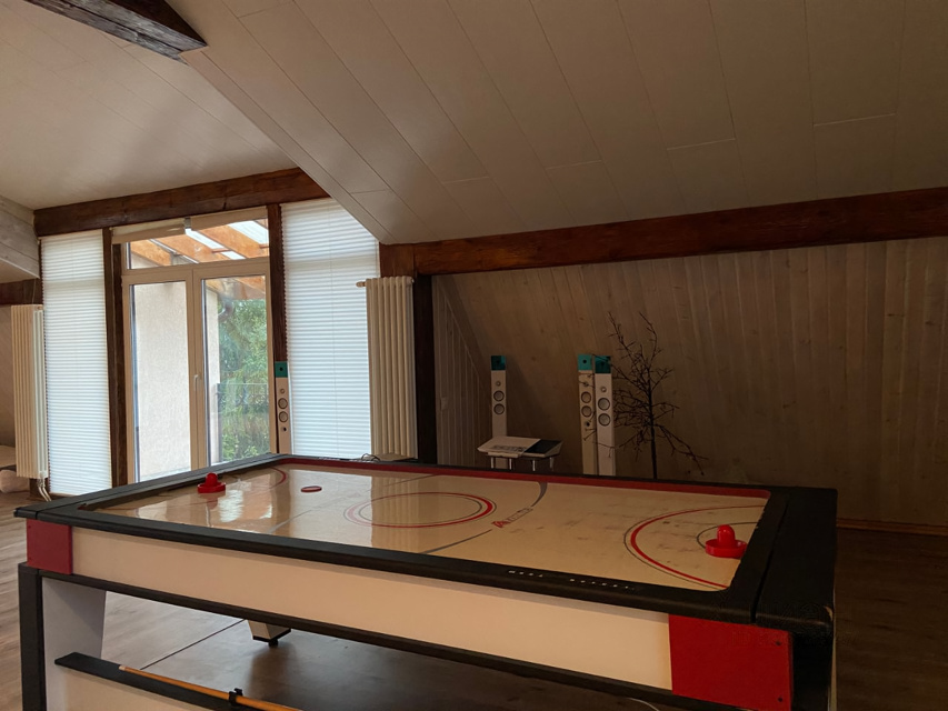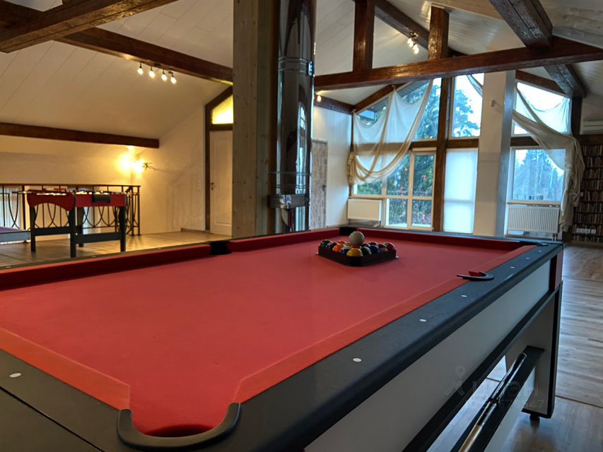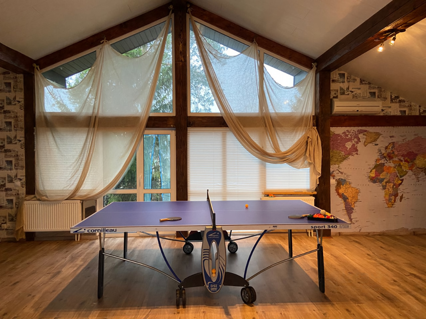 Для активных посетителей коттеджа оборудован третий этаж со столом для покера и карт, бильярдным и теннисным столами, аэрохоккем, настольным футболом, мягкими плюшевыми медведями и современной стереосистемой.