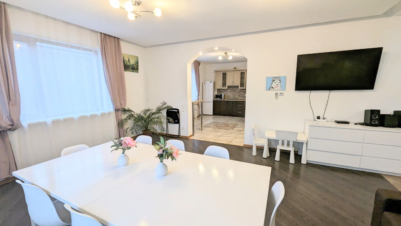 Сдаётся посуточно и долгосрочно совершенно новый коттедж для больших компаний 10-12 человек в 1 км от горнолыжного курорта Игора. Рядом с Сосново. Современная Отделка, уютные спальни и гостиная, большая сауна, кондиционер , огромный телевизор в гостиной и на 2 этаже. Барбекю, шезлонги , благоустройство, Детская площадка 5 отдельных спален. Посудомойка, большая стиральная машина, закрытый двор. На территории беседка и Детская площадка!! Постельное белье, полотенца, посуда все входит в стоимость!!