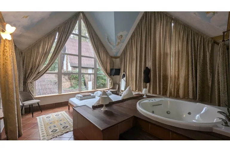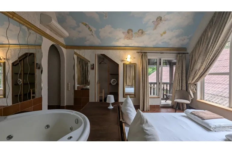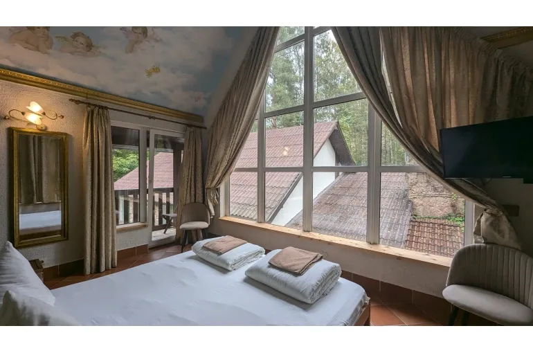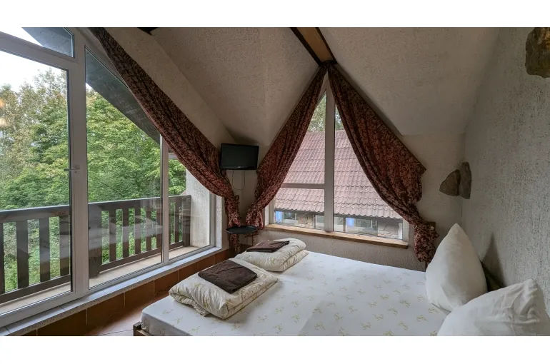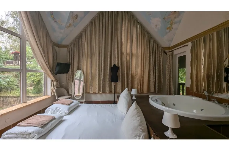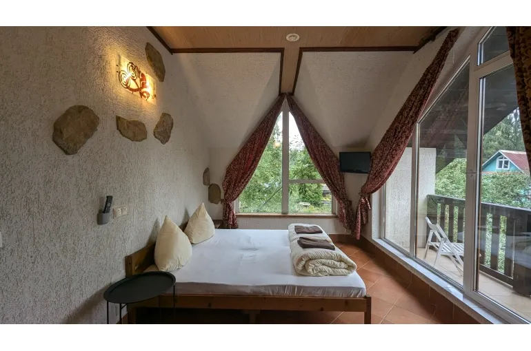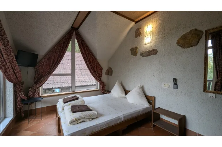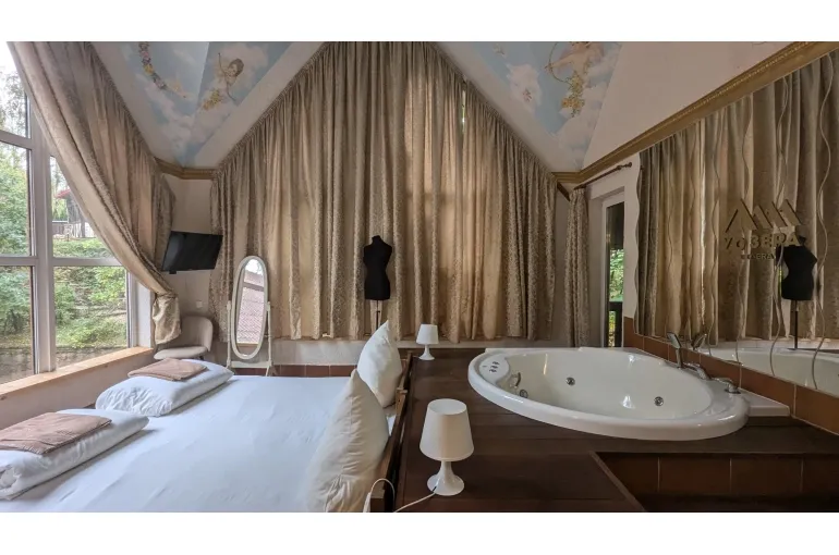 Просторный коттедж на берегу озера для больших компаний. Дом находится на территории свадебного банкетного комплекса с рестораном. При желании можно организовать питание и любое мероприятие в зале коттеджа. 11 спален с панорамными окнами, балконами с видом на озеро готовы вместить до 40 человек (30 основных) . В главной спальне джакузи. В каждой комнате свой санузел, телевизор и кондиционер.
